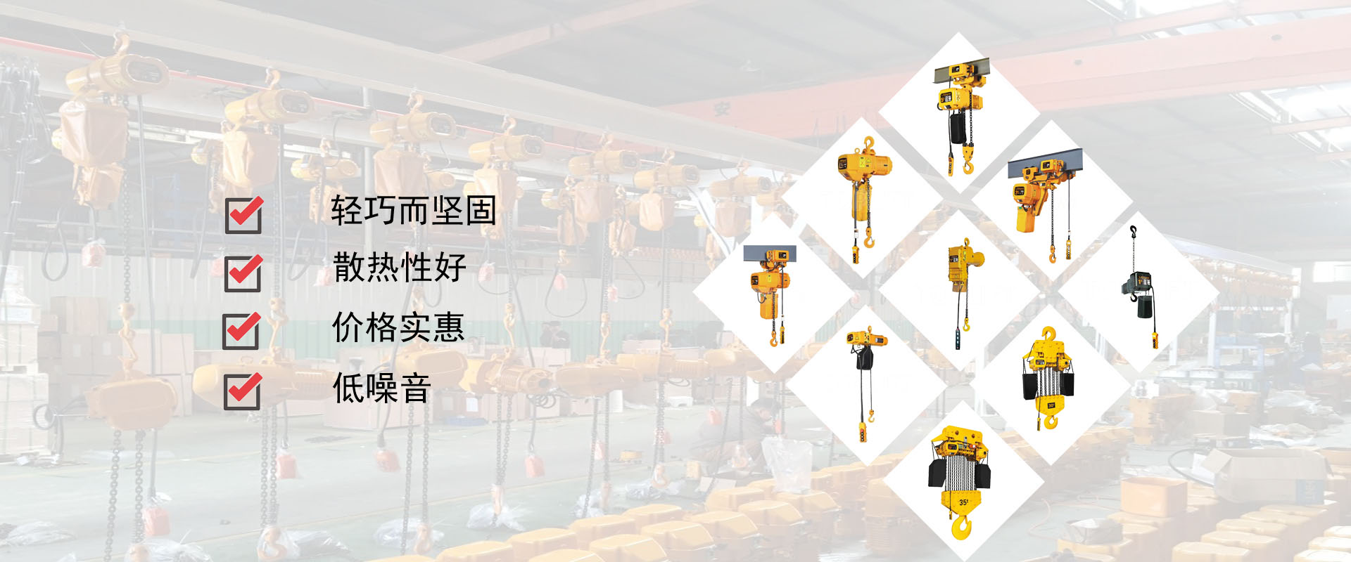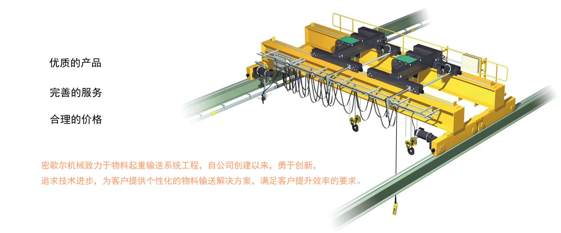 密歇爾起重機(jī)械(杭州)有限公司提供全面的起重輸送產(chǎn)品和服務(wù),產(chǎn)品覆蓋環(huán)鏈電動(dòng)葫蘆(125Kg-80T),歐式鋼絲繩葫蘆,防爆葫蘆,懸臂吊,KBK柔性起重機(jī),歐式起重機(jī),起重馬達(dá),端梁,起重移動(dòng)供電系統(tǒng)等,在國(guó)內(nèi)外被廣泛的應(yīng)用于生產(chǎn)車(chē)間,汽車(chē),模具,機(jī)械制造,鐵路,船舶,物流搬運(yùn),現(xiàn)代化工廠流水線等工業(yè)及其它特殊用途。